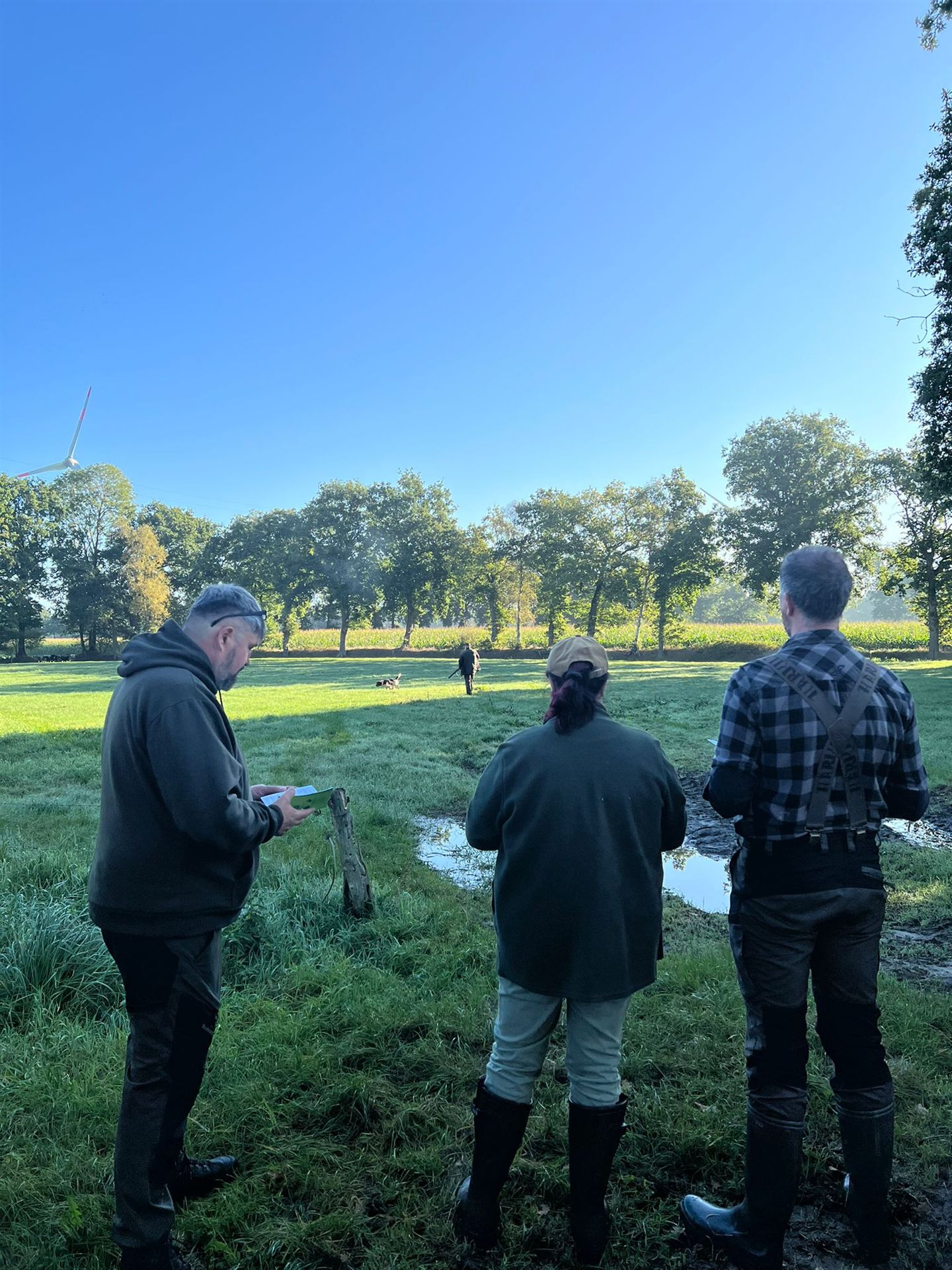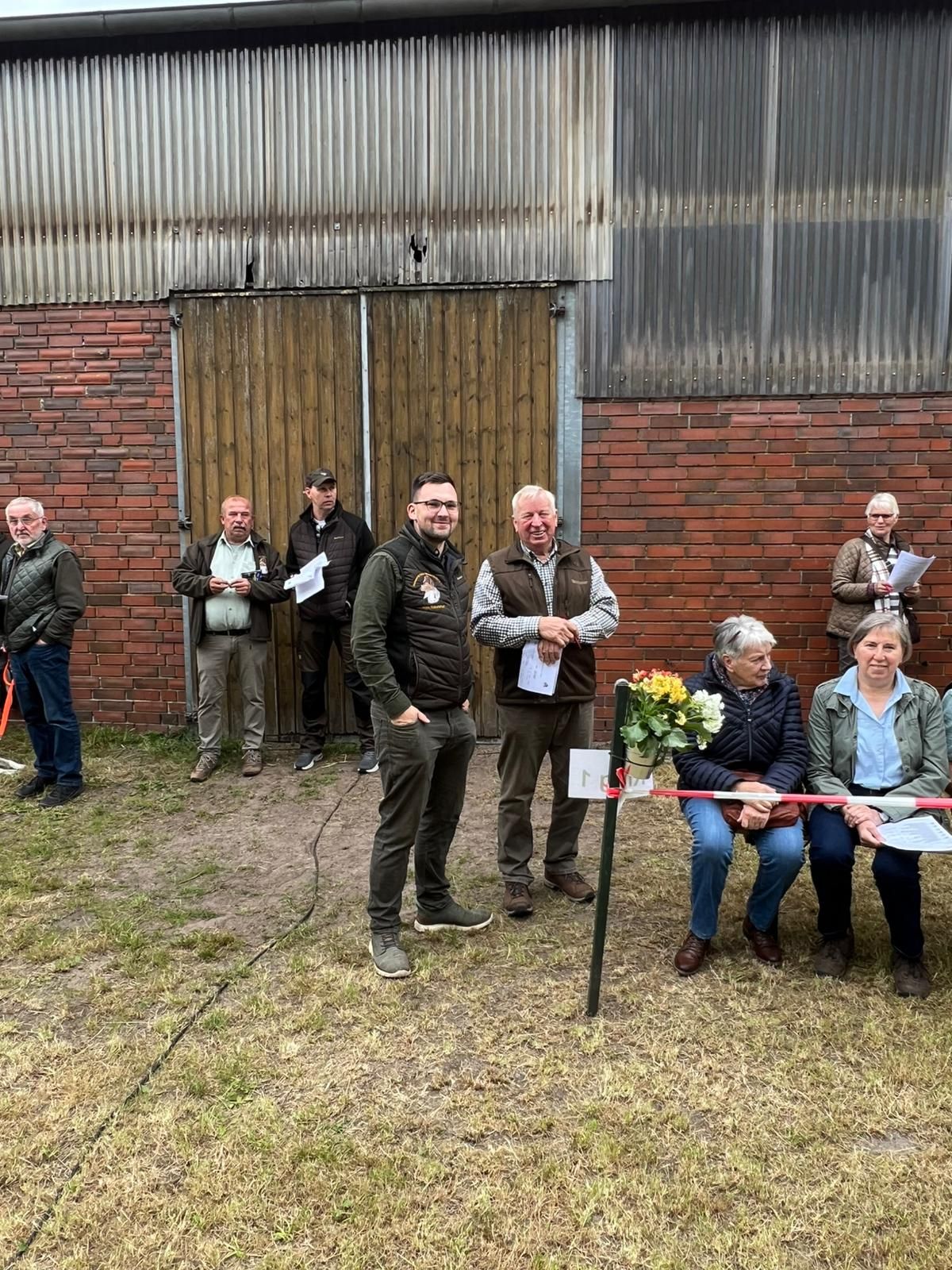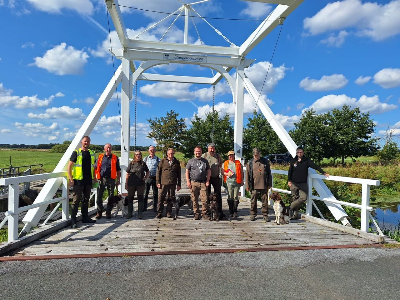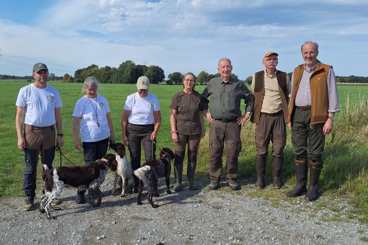 Am 06.09.2025 trafen wir uns gegen 7.30 Uhr am Brauhaus in Bagband. Nachdem alle Hundeführer mit Ihren Vierbeinern, alle Richter und Richteranwärter, die Revierführer und interessierten Zuschauer anwesend waren, begrüßte Prüfungsleiter Tido Bent alle herzlich im Namen er LG Waterkant. Nachdem „der Schriftkram“ erledigt war, wurde im Beisein aller eine Richterbesprechung durchgeführt. Dabei wurde noch einmal explizit auf das Punktesystem und die Arbeit an der lebenden Ente angesprochen. Nachdem ein Gruppenfoto gemacht wurde, brachen die beiden Gruppen bei sonnigem Wetter in die Reviere Bagband und Aurich-Oldendorf auf. Gruppe 1 begann am Wasser, während Gruppe 2 mit der Feldarbeit anfing.