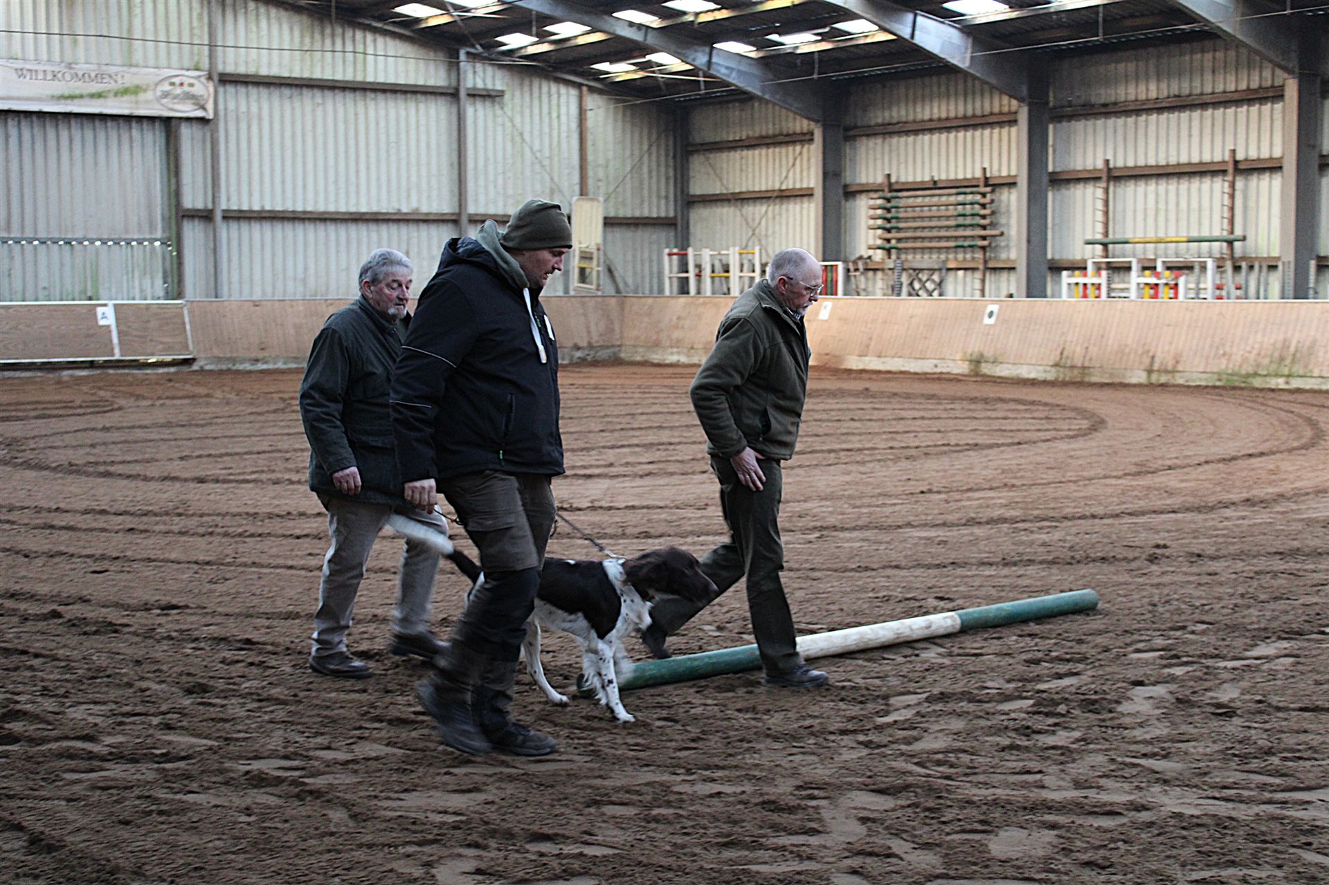 Als Treffpunkt diente die Zimmerei Werner Haak in Ostrhauderfehn, von wo aus die Schulung ihren Lauf nahm. An beiden Tagen vermittelte Uwe Heiß nicht nur fundiertes theoretisches Wissen, sondern zeigte auch anschauliche praktische Übungen, darunter u.a. die Suchen-Arbeit im Feld, das Vorstehen sowie das Arbeiten auf der Schweißfährte.